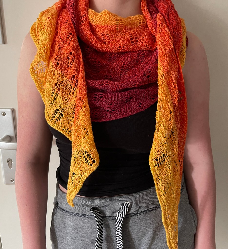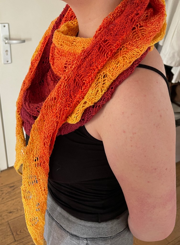 Mir gefällt das Tuch richtig gut und ich hoffe, der damit bedachten Kollegin gefällt es auch so gut. Es hat eine Spannweite von fast 2 Metern und ist ca. 45 cm an der breitesten Stelle.