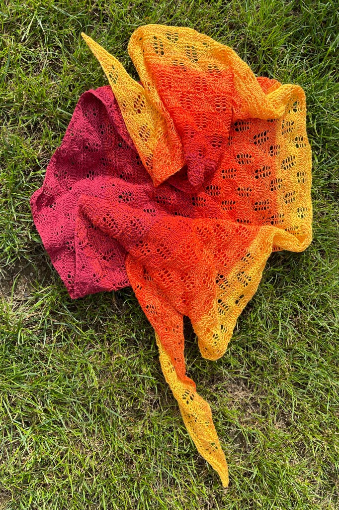 Es handelt sich um das „Lake Covered Window Tuch“ , welches ich für eine Kollegin meiner Frau gestrickt habe. Sie hatte sich den Babble Baumwollgarn gekauft und uns geschenkt, da sie keine großen Teile mehr stricken kann. Da weder meine Frau noch meine Töchter Tücher im Farbverlauf tragen, habe ich dann beschlossen als Überraschung ein Tuch für eben diese Kollegin zu stricken. Ich hoffe, es gefällt ihr dann auch. Ich habe allerdings 1,5 Mustersätze mehr gestrickt als in der originalen Anleitung empfohlen, da ich noch so viel Wolle hatte.