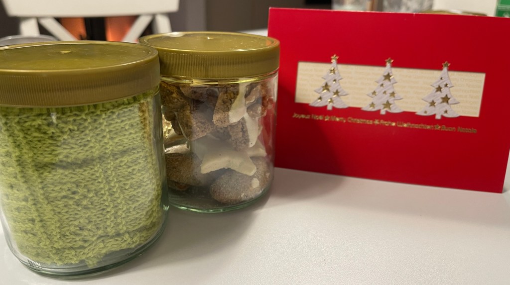Die Socken in Größe 37 sind für eine liebe ehemalige Arbeitskollegin, welche mich mit leckerem Honig von den eigenen Bienen versorgt hat. Deshalb sende ich ihr die Socken in den leeren Gläsern zurück und habe auch noch eine Weihnachtskarte beigelegt. Ein paar selbstgebackene Plätzchen dürfen auch nicht fehlen.