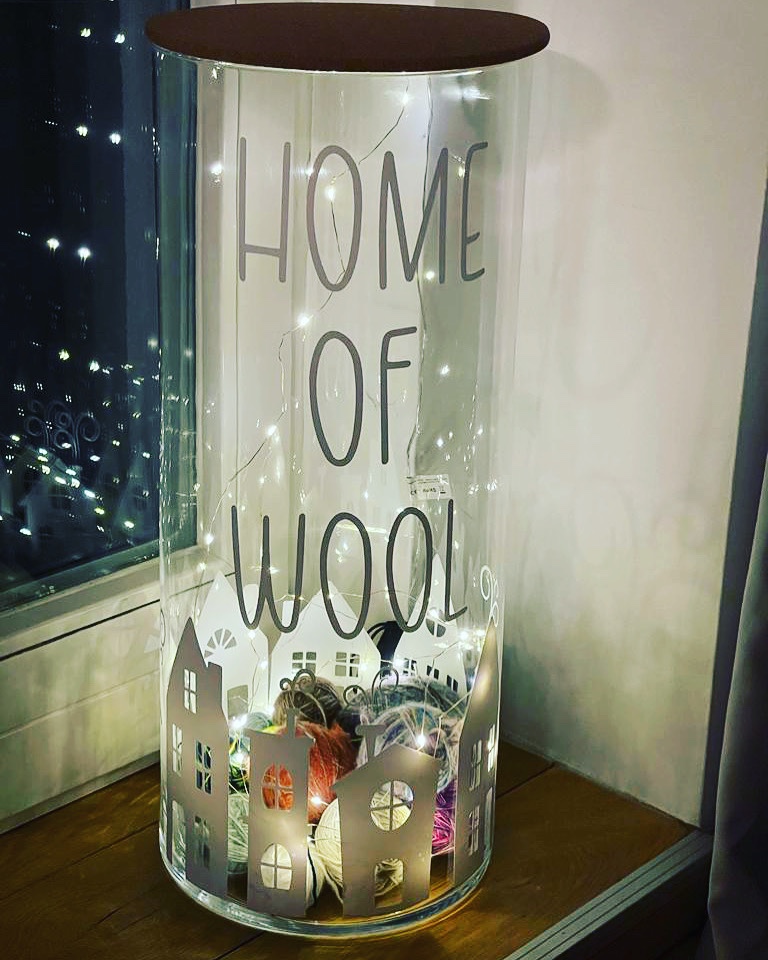 Die Häuser und auch die Schrift „HOME OF WOOL“ sind in dem Design Space von Cricut entnommen und die weiße Folie ist ebenfalls von Cricut. Wir sind mit dem Ergebnis super zufrieden für eines unserer ersten Projekte. Meine Frau hat dann noch eine batteriebetriebene Minilichterkette reingelegt und nun ist es abends auch nett beleuchtet.