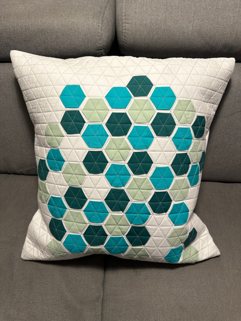 Drei Kissen sind ebenfalls entstanden. Das in der Mitte mit den kleinen Hexagons ist heute erste fertig geworden. Kissen sind besonders praktisch um damit quilten zu üben, da die Fläche recht klein ist und man einen guten Überblick hat. Es wird so langsam von mal zu mal besser.