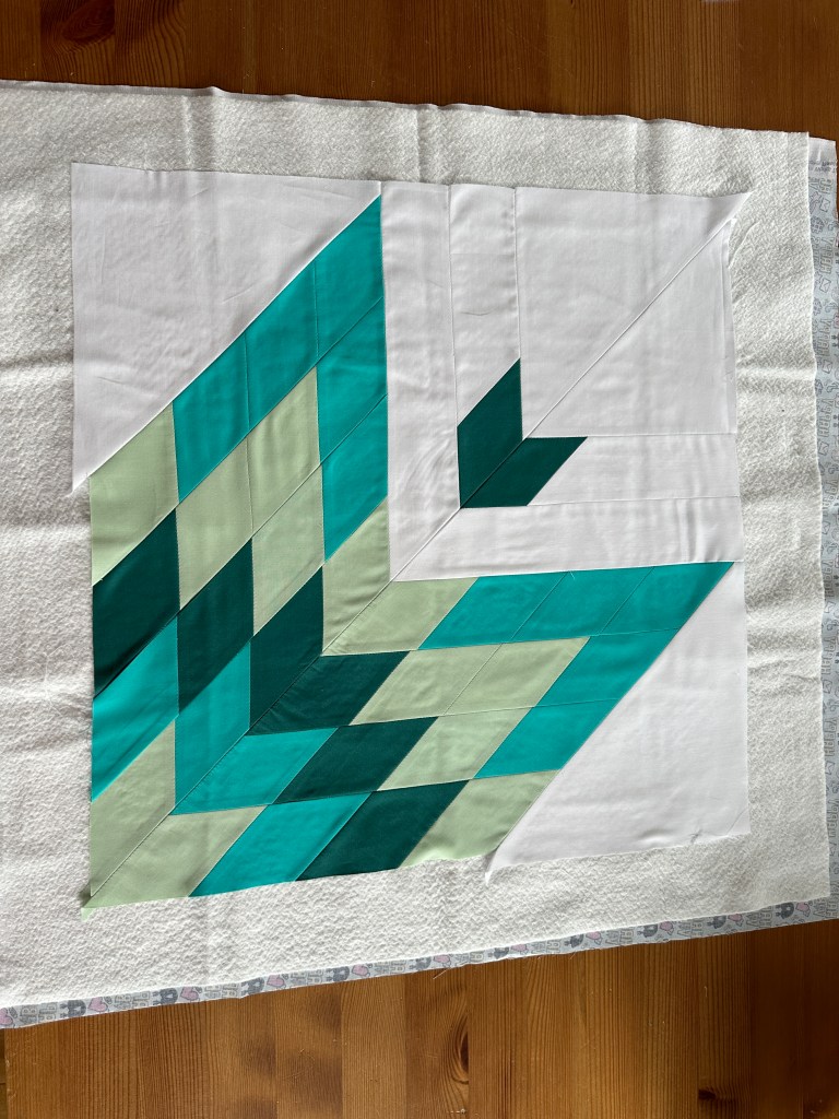 Dazu habe ich aber auch noch an der Nähmaschine gesessen und das Top meines „LoneStar Kissens“ aus der Nähgang zuerst zugeschnitten und dann zusammengenäht. Hier brauche ich definitiv noch ein wenig mehr Übung, aber für den ersten Versuch „Diamanten“ zu schneiden war es schon ganz gut und ich bin zufrieden. In den nächsten Tagen werde ich es quilten und dann den Hotelverschluss anbringen. Das Top liegt schon auf dem Quiltvlies und ist auch schon mit Sprühkleber fixiert, ebenso wie die Rückseite für die ich einen Reststoff verwendet habe, da die Rückseite in der Kissenhülle verschwindet. Leider kann ich hier keine Anleitung verlinken, da die Nähgang ein geschlossener Bereich nur für Mitglieder ist.