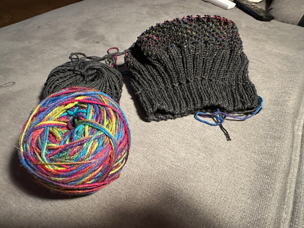 Es handelt sich um den Büsum Cowl. Ich stricke riesenausschließlich aus Wolle aus meinem Stash da mein Wollvorrat inzwischen für mehr als ein Leben reicht. Es handelt sich um drei Knäul „Merino Extrafeine 170“ von Schachenmayr in der Farbe 00098 und dazu ein gut abgelagertes buntes Knäul handgefärbter Wolle in der Stärke DK von dem ich leider keine Banderole mehr habe und daher nicht sagen kann was es ist und vom wem es gefärbt wurde. Aktuell hier mein Stand am Projekt
