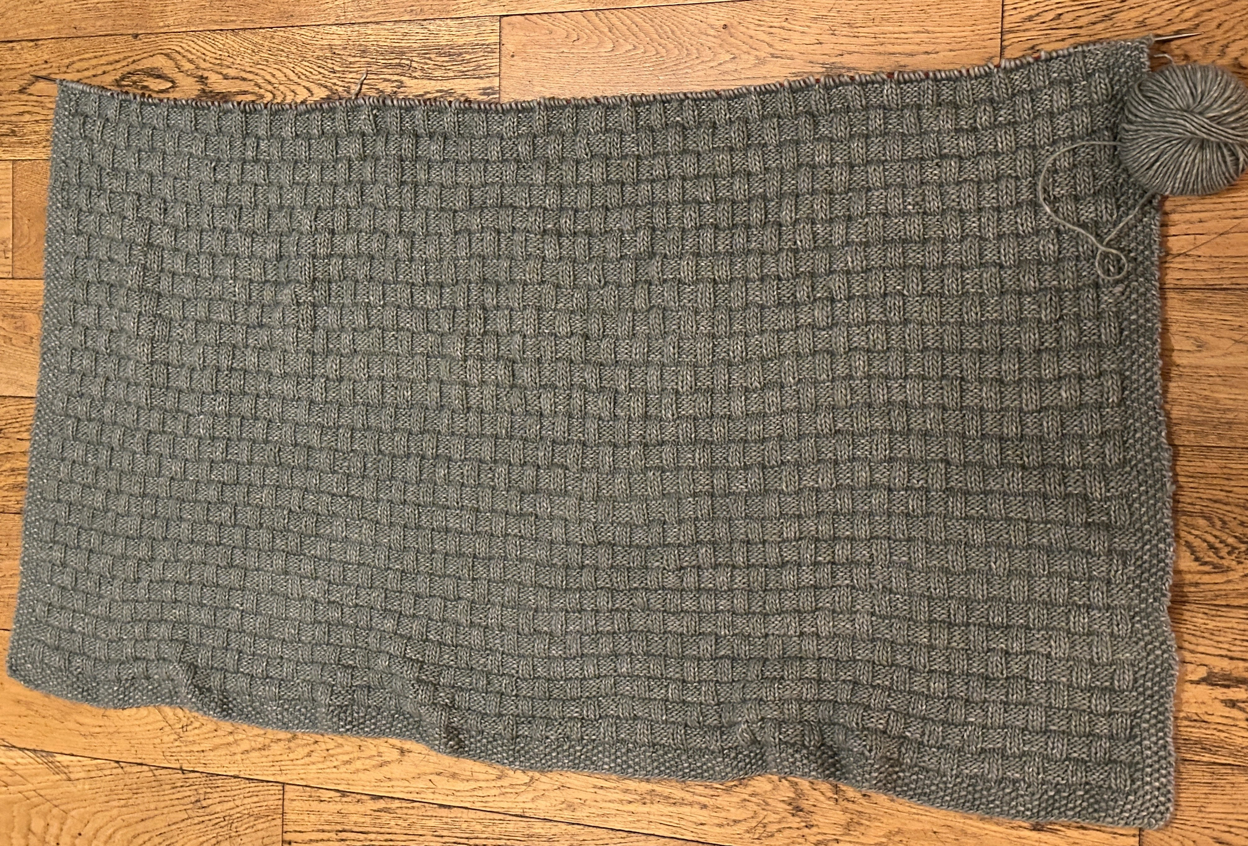 Weitergearbeitet habe ich an der Wolldecke von der Schachenmayer-Hompage mit dem tollen Namen „Plaid, S10061“. Ich habe insgesamt 40 Knäul des Garns „Originals Tweed Style“ von Schachenmayer gekauft und davon aktuell 15 Knäul, also etwas mehr als ein Drittel verstrickt. Die Decke hat die Maße von ca. 160cm breit und ist aktuell ca. 85 cm hoch. Gestrickt wird mit einer Nadelstärke 5,5 mm. trotz den 218 Maschen pro Reihe geht das Muster flott von der Hand und ruckzuck ist ein weiteres Knäul verstrickt. Gestrickt wird im Korbmuster mit einem Perlrand. Anbei ein Bild vom Stand meines aktuellen Werks. Die Anleitung gibt es kostenlos unter diesem Link direkt bei Schachenmayr: https://schachenmayr.com/Plaid-S10061/SCHWEBD-S10061