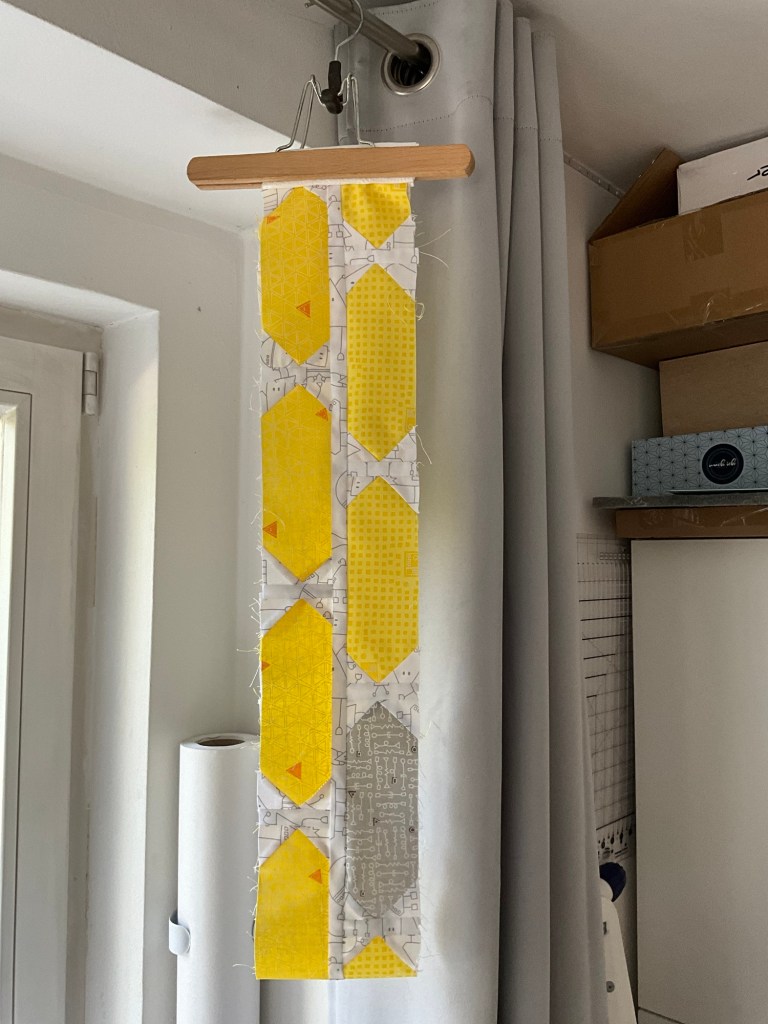 Nun wartet die erste fertige Reihe auf die noch folgenden, indem sie im Nähzimmer auf einem Hosenbügel an der Gardienenstange hängt.