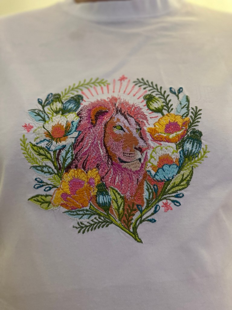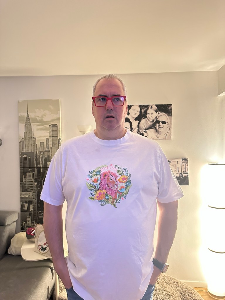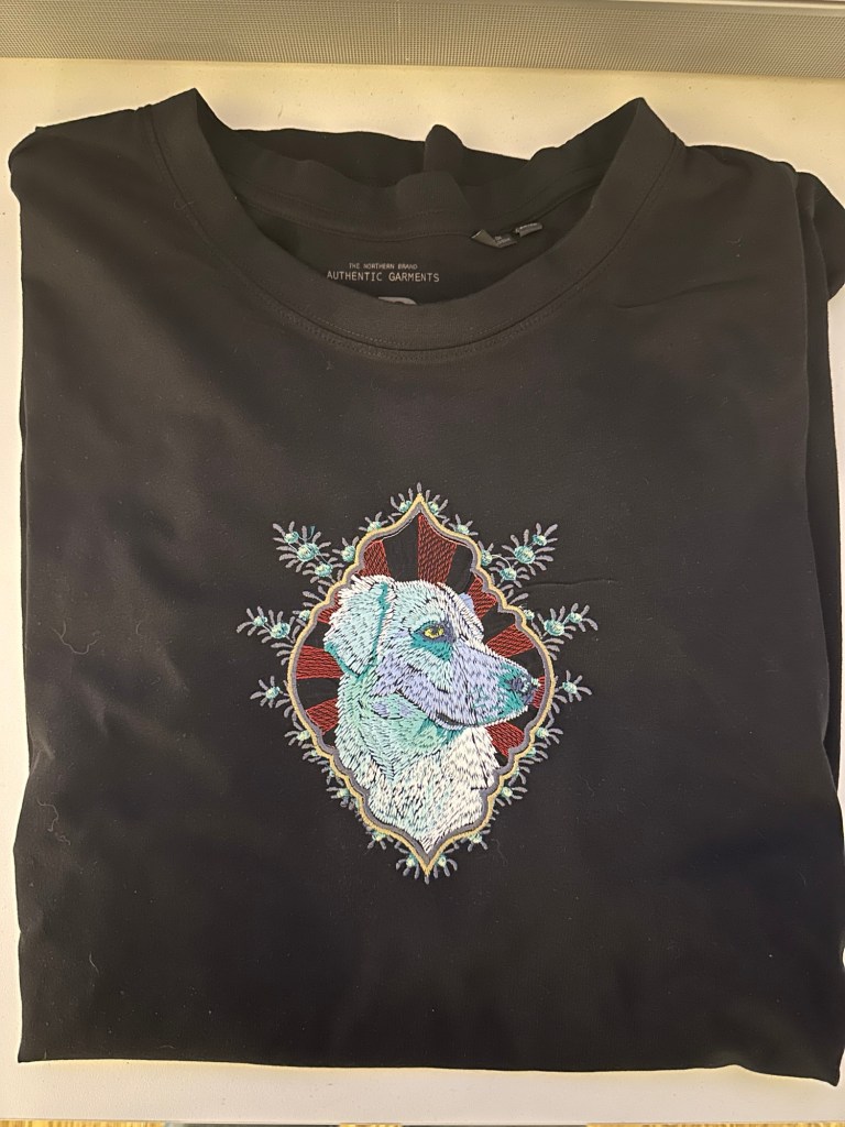 Gestern habe ich schon ein T-Shirt bestickt, das Motiv war aber größer und hatte mehr Farbwechsel. Es hat insgesamt fast 5 Stunden gedauert. Aber die Mühe hat sich gelohnt wie ich finde.
